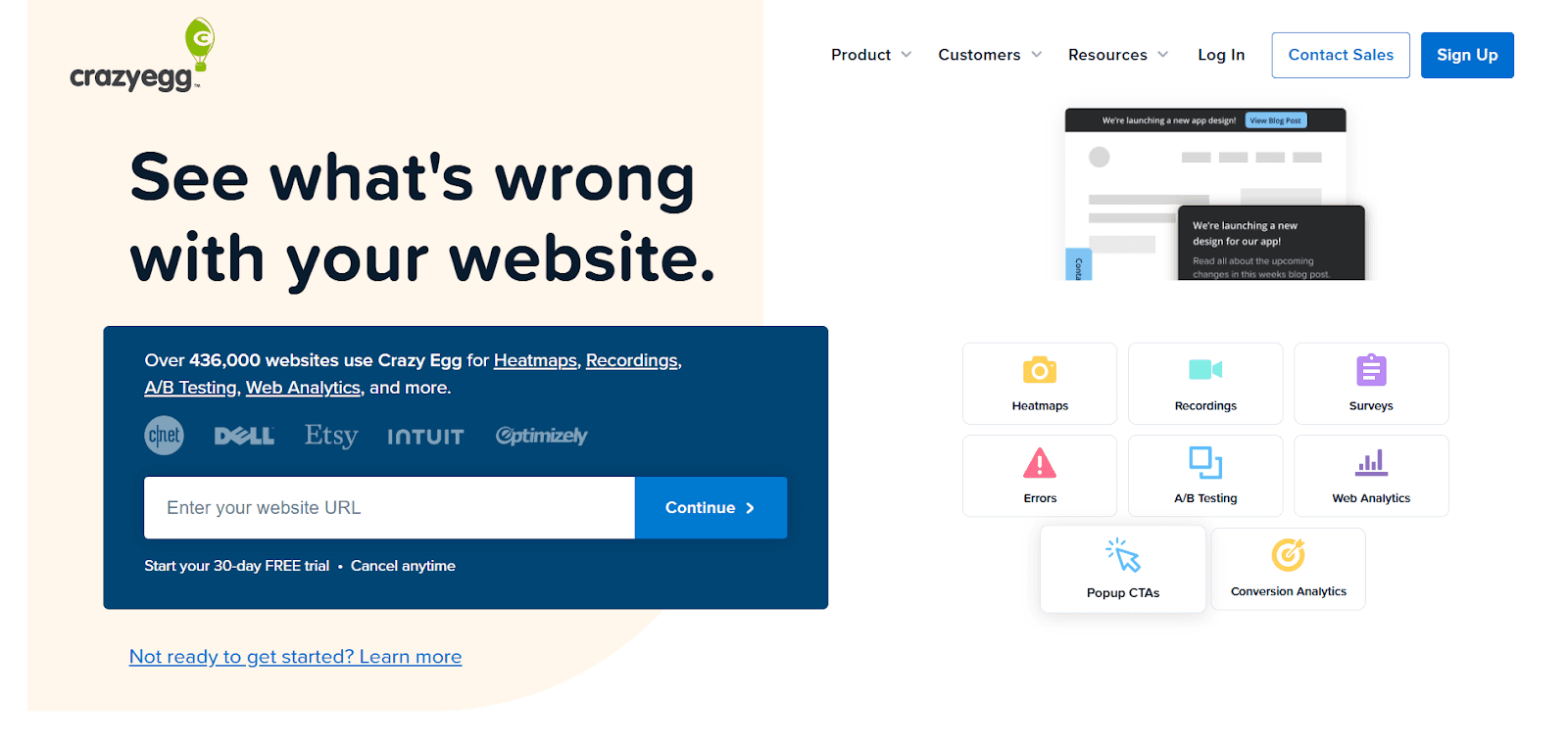 Next up, we have another web optimization tool, Crazy Egg. You can run A/B tests and heatmaps to understand user behavior. Error tracking spots technical issues so you can fix them quickly. The visual color gradients make it clear where attention concentrates and where it wavers, helping you adjust layout and content to match visitor behavior