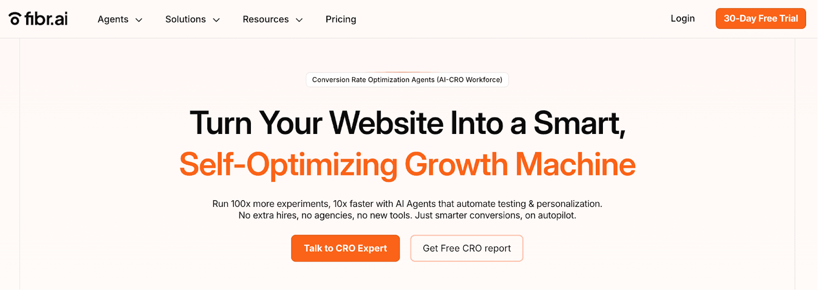 This is exactly where Fibr AI comes in as an AI CRO platform built around message match and dynamic experiences, with named AI agents that handle the grunt work of keeping your pages aligned with every click.
