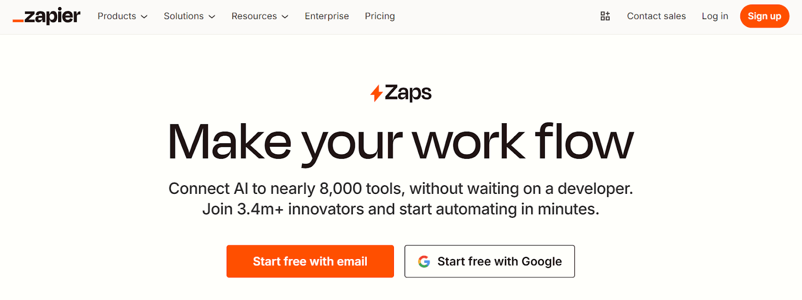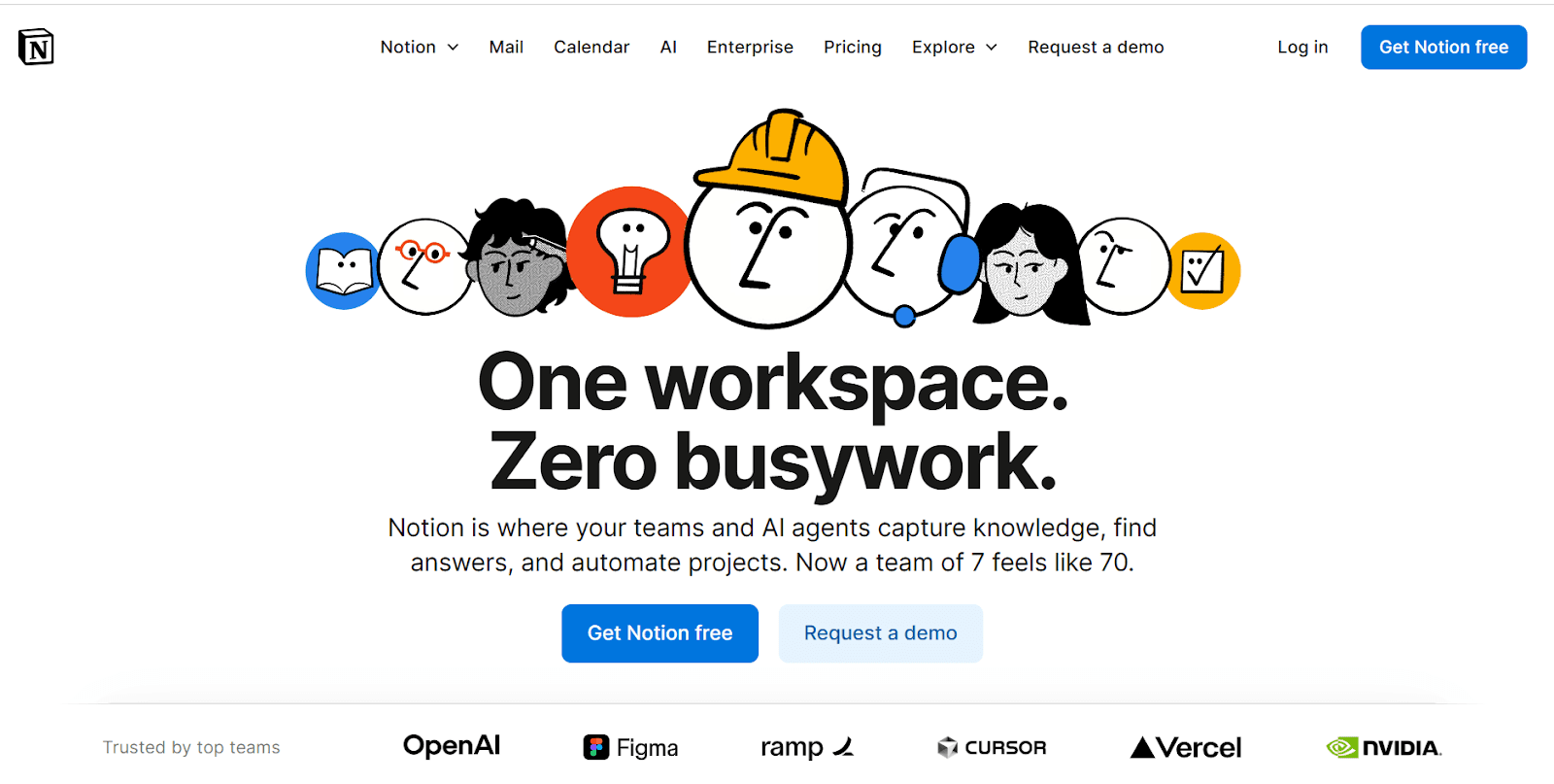 Notion’s landing page nails clarity. The headline (one workspace. zero busywork.) quite nicely nails the intent of the product. Next, the subheadline in simple terms explains what the product does alongside the benefit (team of 7 feels like 70).