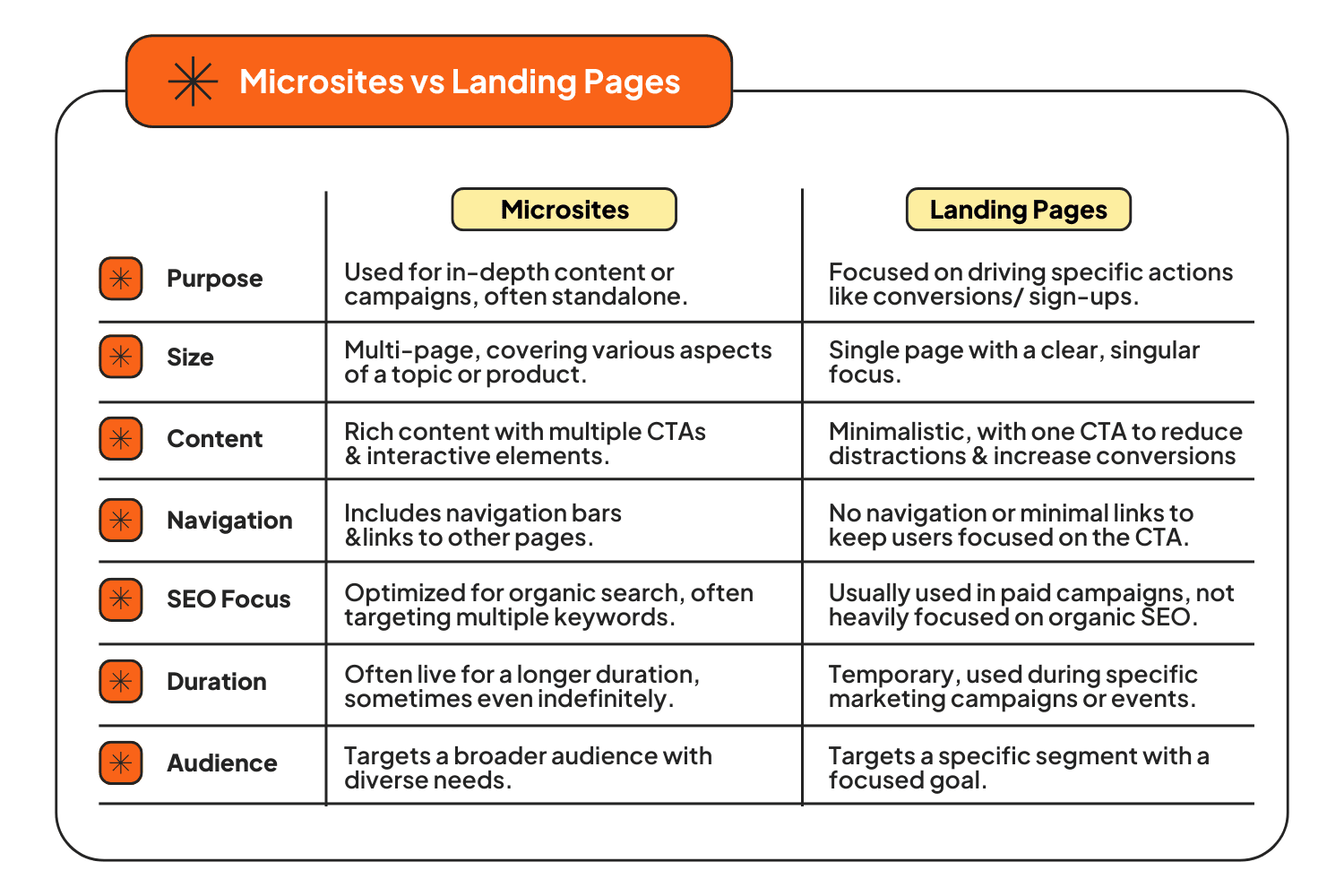 Microsites are typically multi-page, standalone website designed for offering in-depth information with multiple CTAs with navigation options. They are optimized for SEO and often live longer.